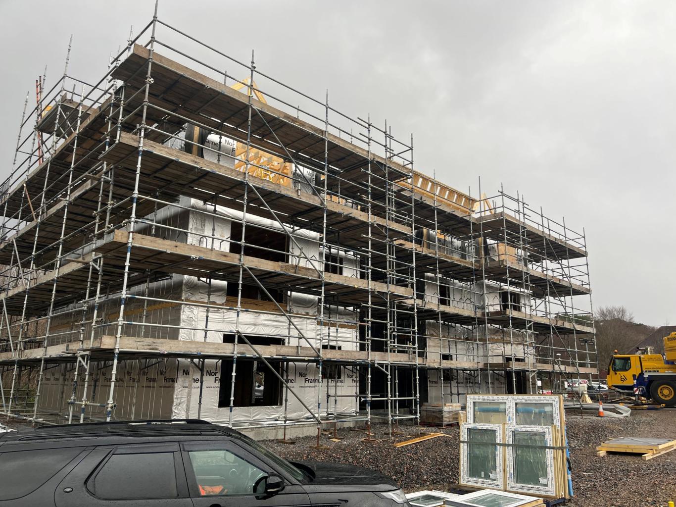 A site start was achieved in July 2025, and TSL Construction Ltd has erected the first timber kit homes and flats for the development. Internally, the furthest advanced units have cabling, pipework and plasterboard installed, ready for finishings (for example kitchens and bathroom fittings) to progress.